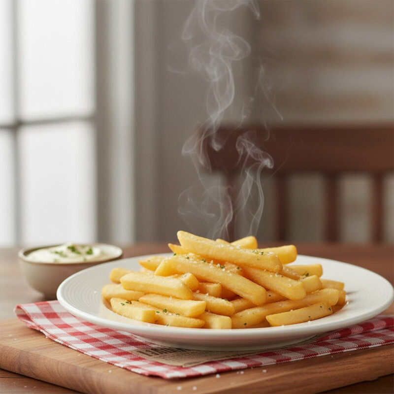 Картопля фрі — хрусткі скибочки картоплі, обсмажені до золотистої скоринки. Ідеальна закуска або гарнір, що поєднується з різноманітними соусами.