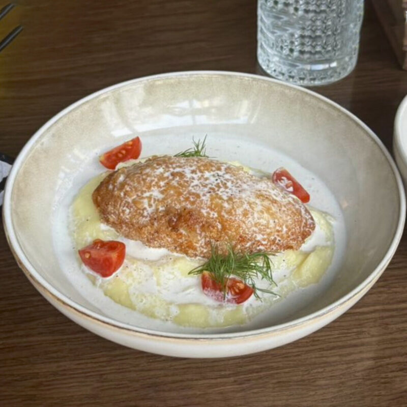 Деруни з бринзою та сметаною — хрусткі картопляні деруни, подані з ніжною бринзою та свіжою сметаною, що створюють чудове поєднання смаків і текстур.