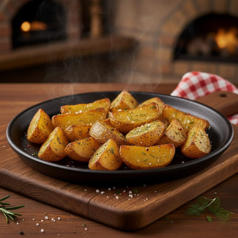 Картопля печена по-селянськи — скибочки картоплі, запечені з часником, спеціями та оливковою олією. Має хрустку скоринку і м’яку серединку, ідеально підходить як гарнір до основних страв.